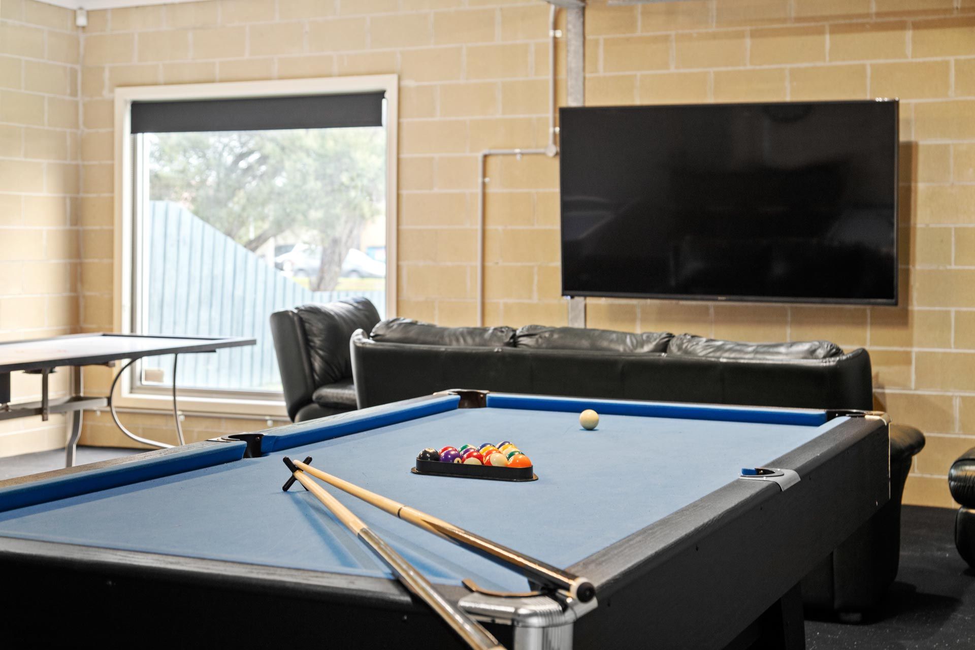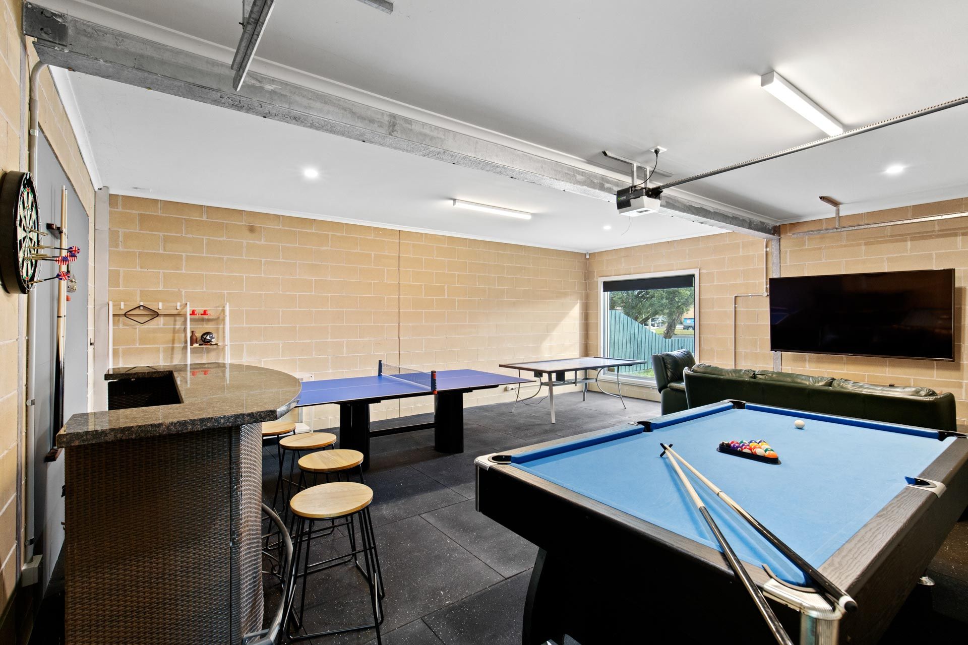 Games room with billiard table & table tennis table and a big screen TV & a dart board.