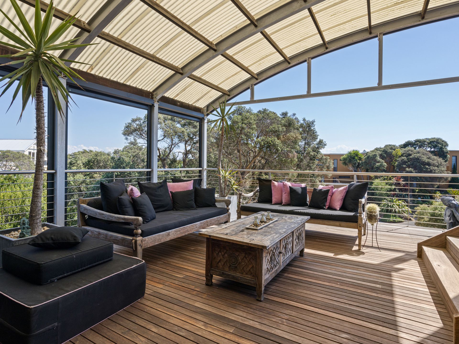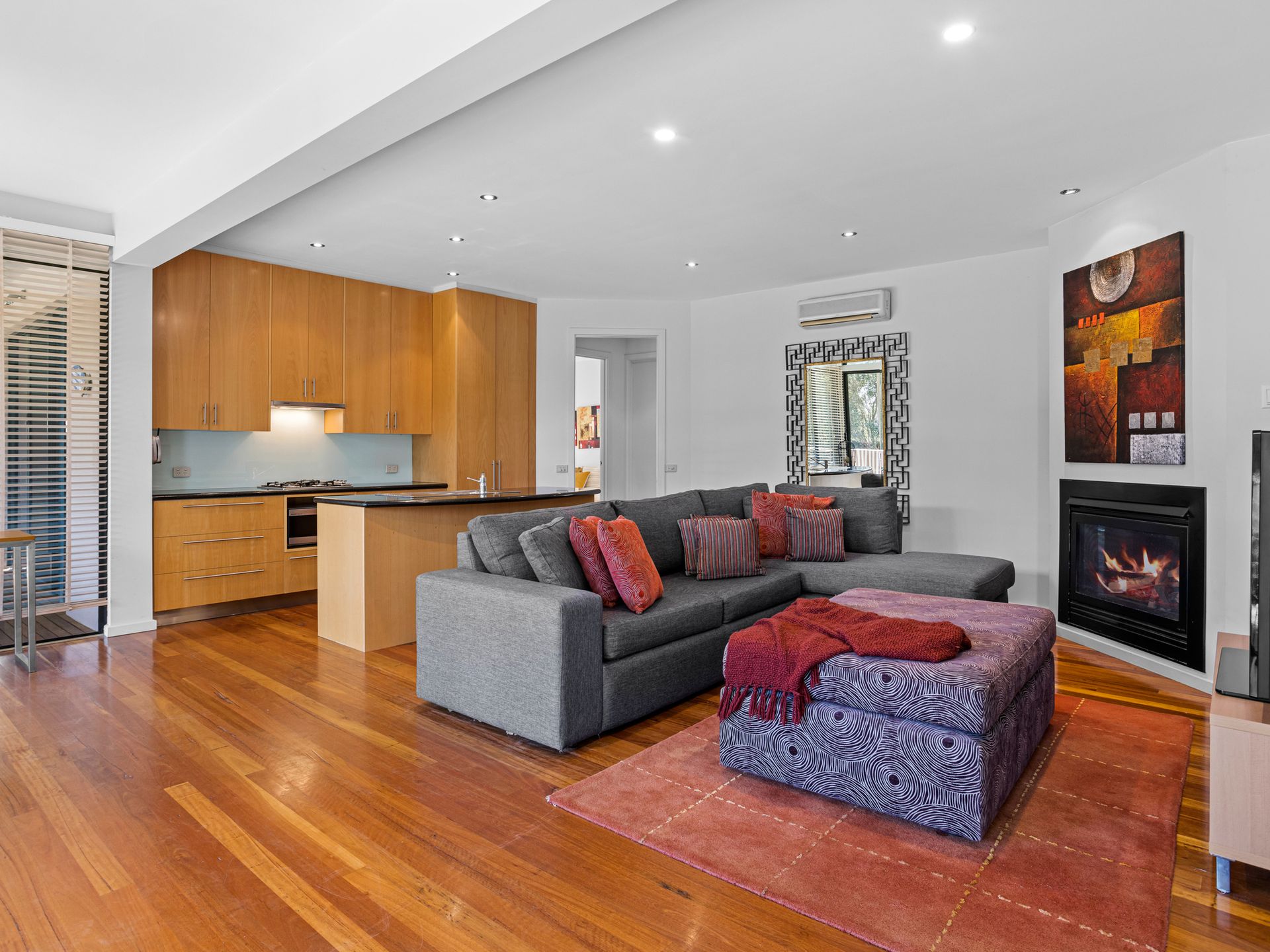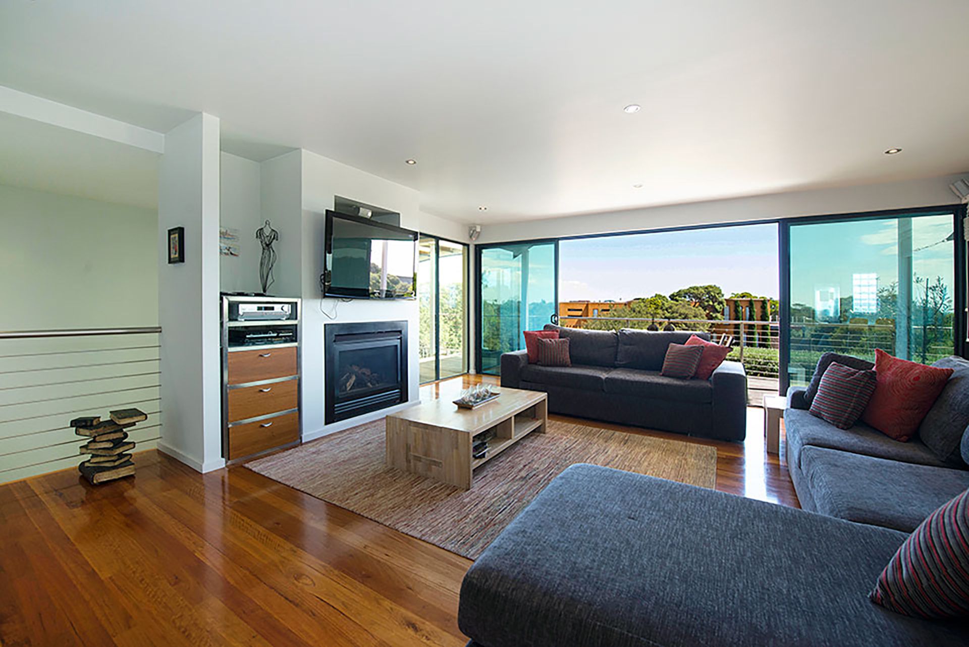 The spectacular main living area includes a gas log fire for winter ambiance, room to lounge and dine and doors that flow out to the wide balcony where there are several outdoor areas with outdoor dining and BBQ, including one next to the Master bedroom, both offering spots to sit and talk or share a drink.