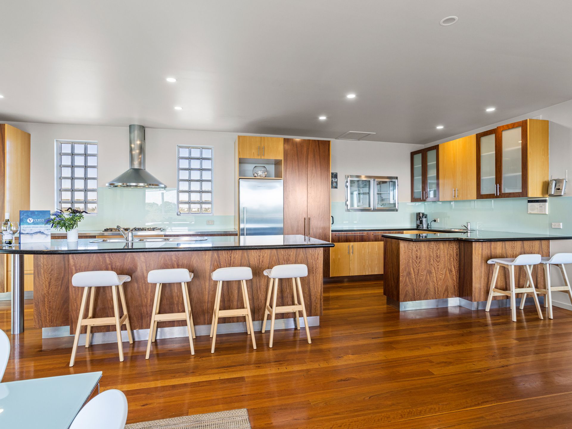 The sensational kitchen includes Jarrah and Beech cabinetry, granite benchtops, Smeg stainless steel appliances, and an adjoining bar or servery area with a wall-mounted drinks fridge with glass doors, while the downstairs living area has a second kitchen and doors that open to the pool terrace & outdoor dining table & lounges by the pool.