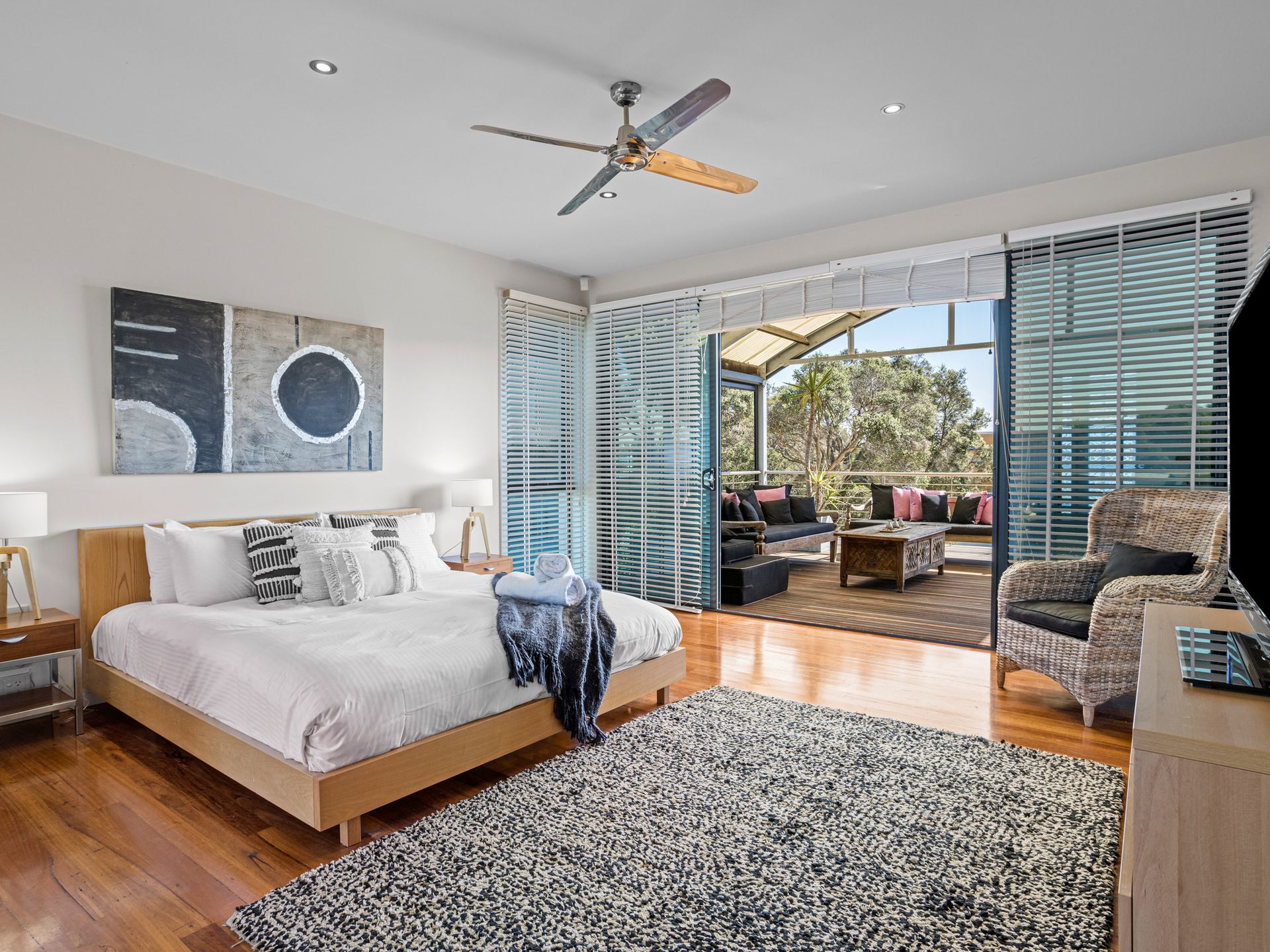 Bedroom 1 - the Master suite is gorgeous, be quick to claim this room! Includes a large King size bed, an oversized ensuite, large TV & split system with direct access to the alfresco lounge where you will find Balinese daybeds- this would give you little reason to leave the room!