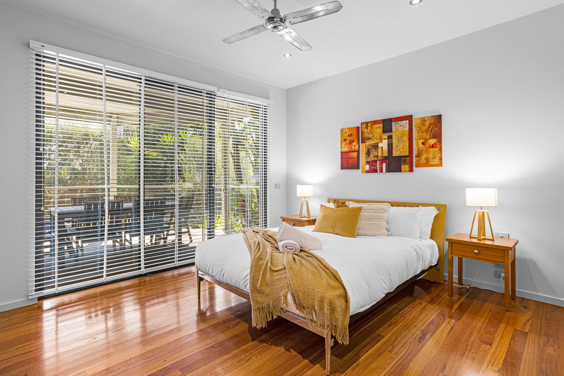 Bedroom 3 - includes 1 x Queen bed, ceiling fan, with sliding door access to pool area
