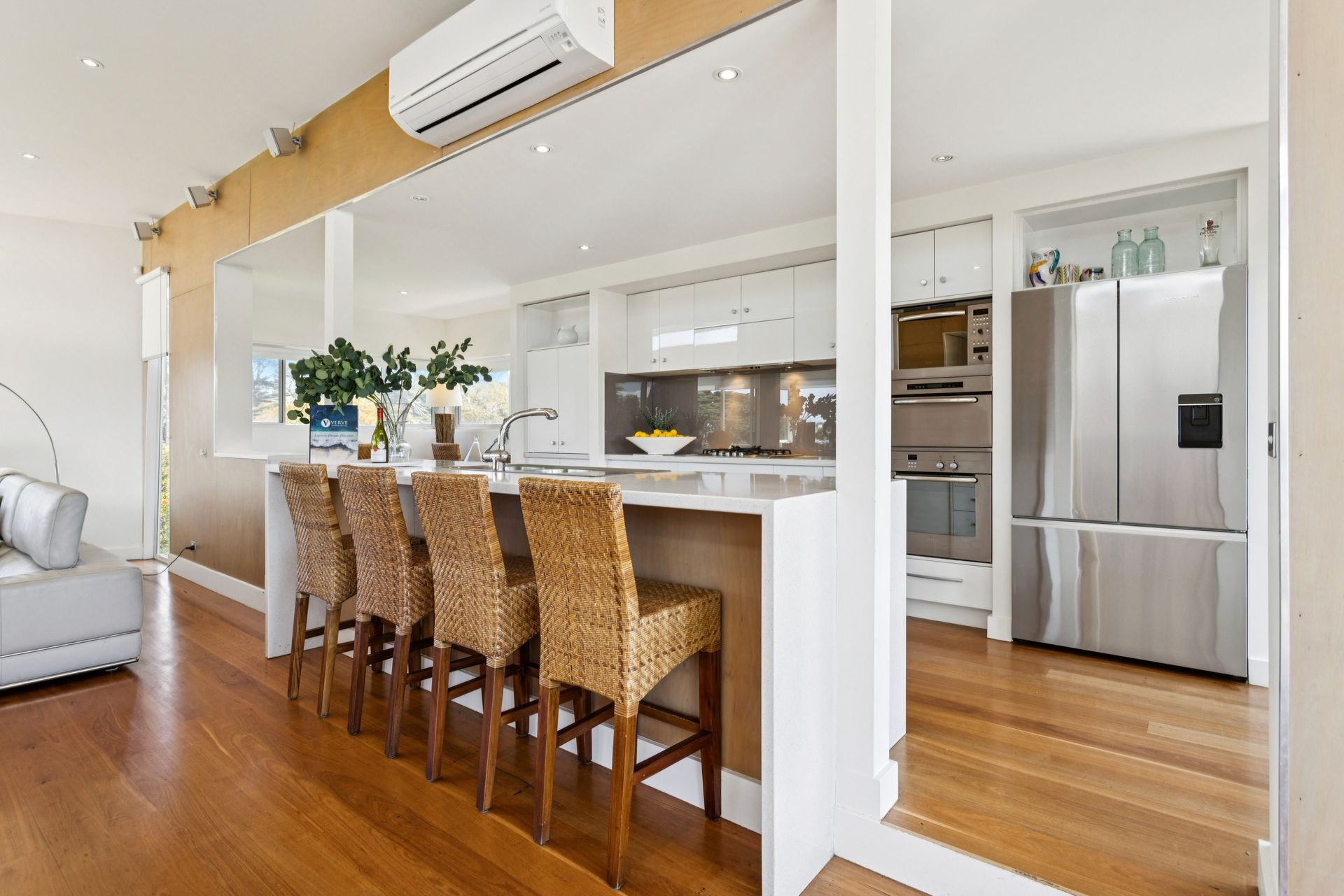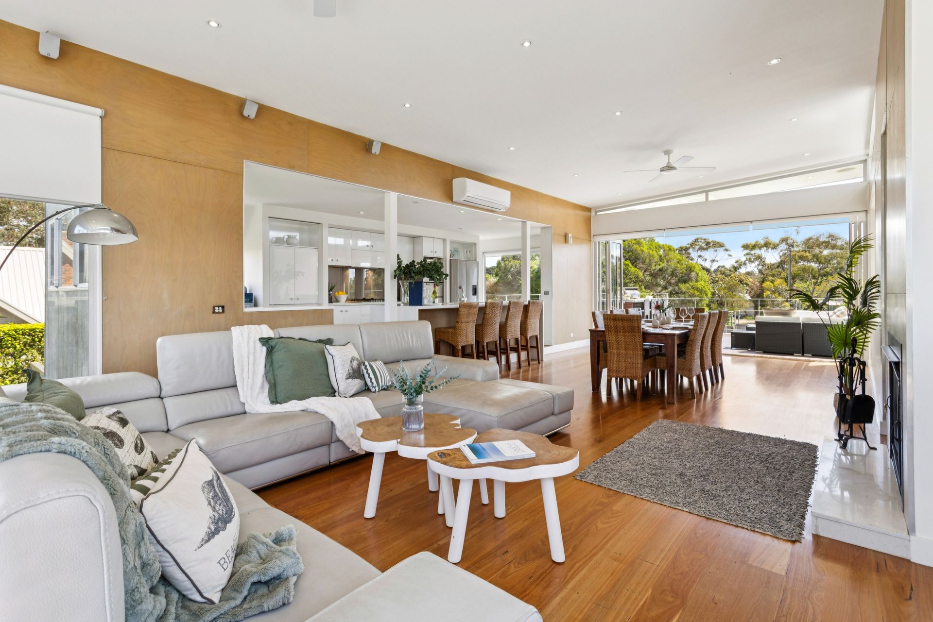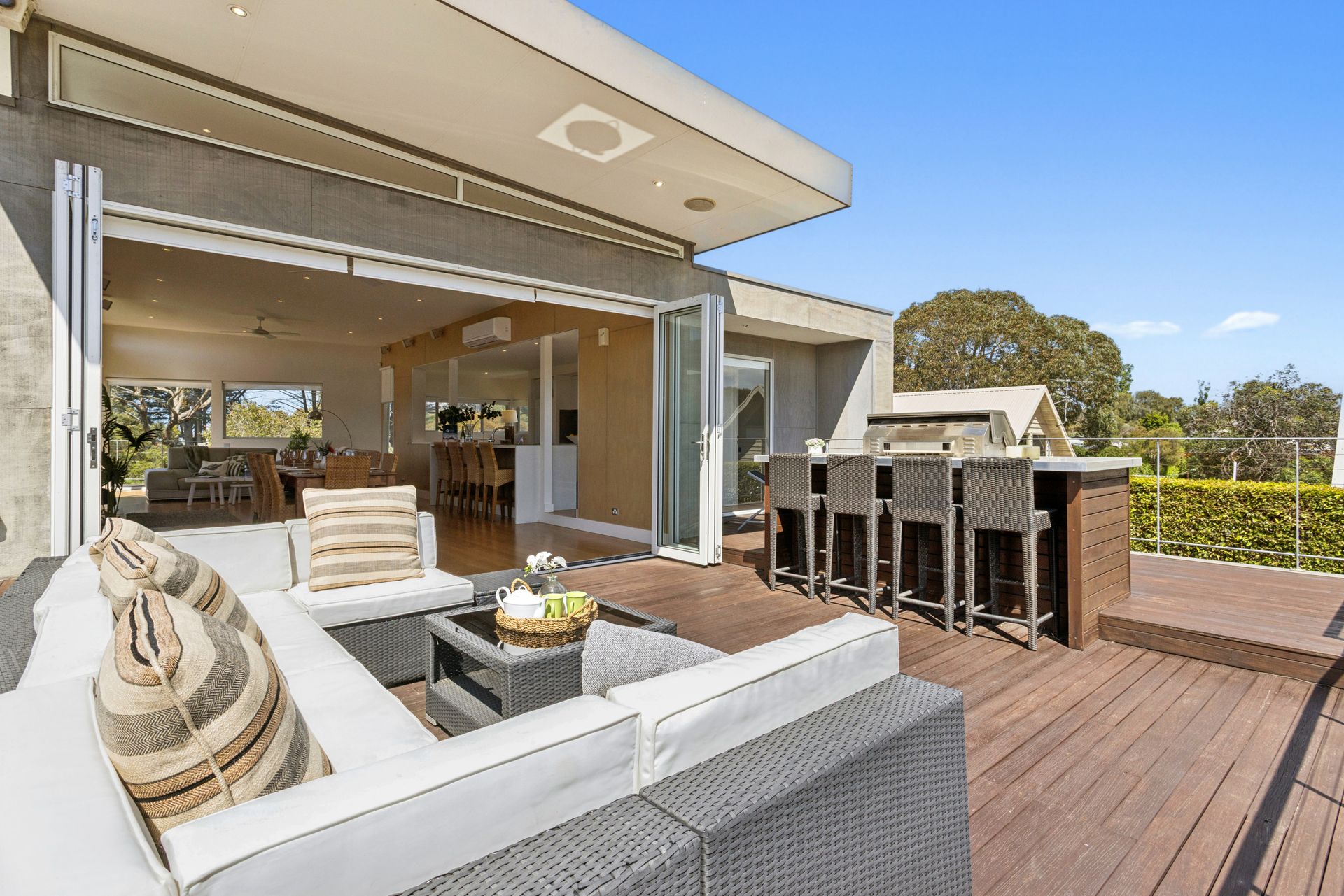 Aside from a double bedroom, the upper level really is dedicated to living. The proportions of this space are huge. The open plan design is not only fabulous but incredibly functional. The reconstituted stone kitchen is elevated by one step and is an inspiring chefs delight. There is ample room to create with the European appliances. A large breakfast bar is a perfect place for you to gather, enjoy a drink and to keep the chef entertained. The 10 seat dining table is adjacent to an entire wall of bi-fold doors that open onto a large deck with inbuilt BBQ, outdoor self-draining wine and beer insulated cooler draws - which just require you to add ice and a large lounge seating area. It effectively means that you can eat or cook both indoors and outdoors. One can not overstate this terrific feature it really is inspired by summers on the Australian coastline! At the opposite end of the living zone are large sumptuous lounges, more bi-fold doors and a superb outlook to the golf course with glimpses of the water. A very easy stroll to some spectacular coastline and the gorgeous village! On the lower level is a family room that has a modular lounge, TV, open fireplace and again a wall of bi-folds which open up onto an undercover deck, including a day bed to laze around on and savor the view. The family room also comes with a wet bar, therefore another great entertaining option!