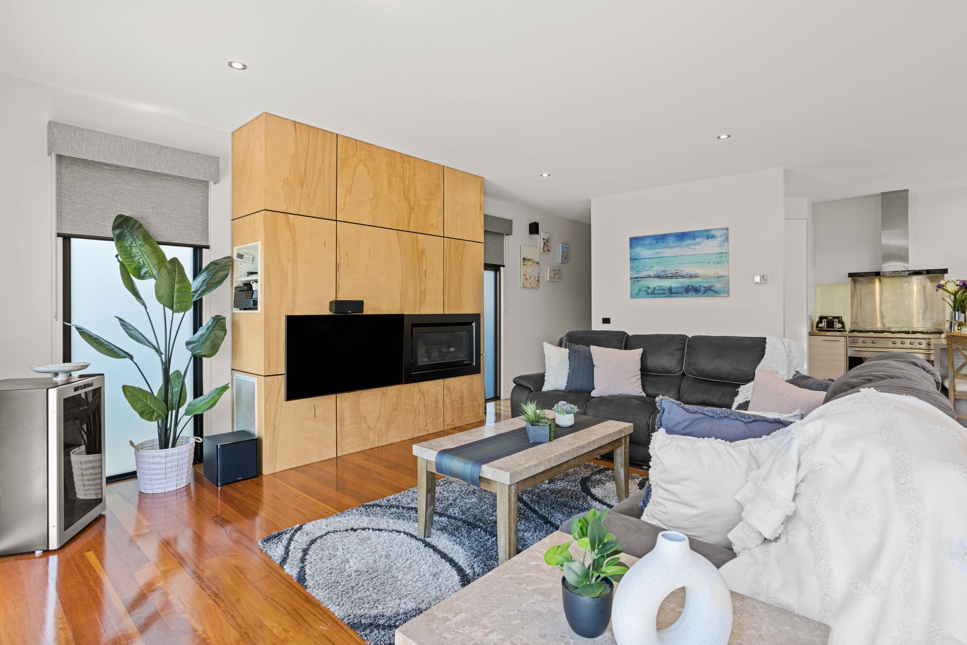 Upon entering Laguna you instantly sense the warmth, style, and relaxed ambiance created by the extensive use of polished timber and glass that cleverly combine to provide a house that's not only both functional and inviting but quite luxurious. You immediately want to entertain in the combined open plan living/ kitchen/ dining area. Laguna is a fabulous year-round proposition for discerning holiday/retreat makers with reverse cycle air-conditioning, gas log fire, and outdoor spa.