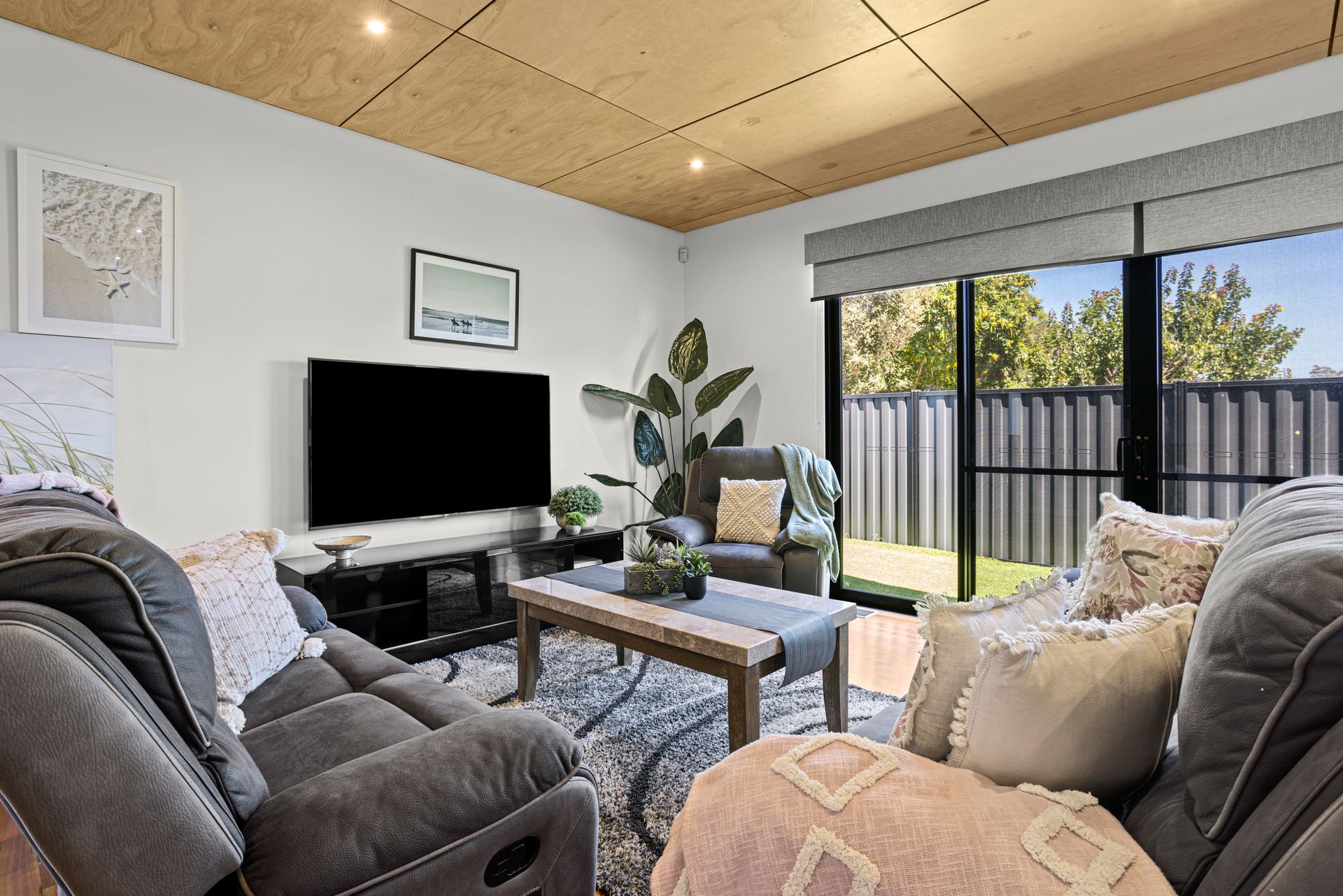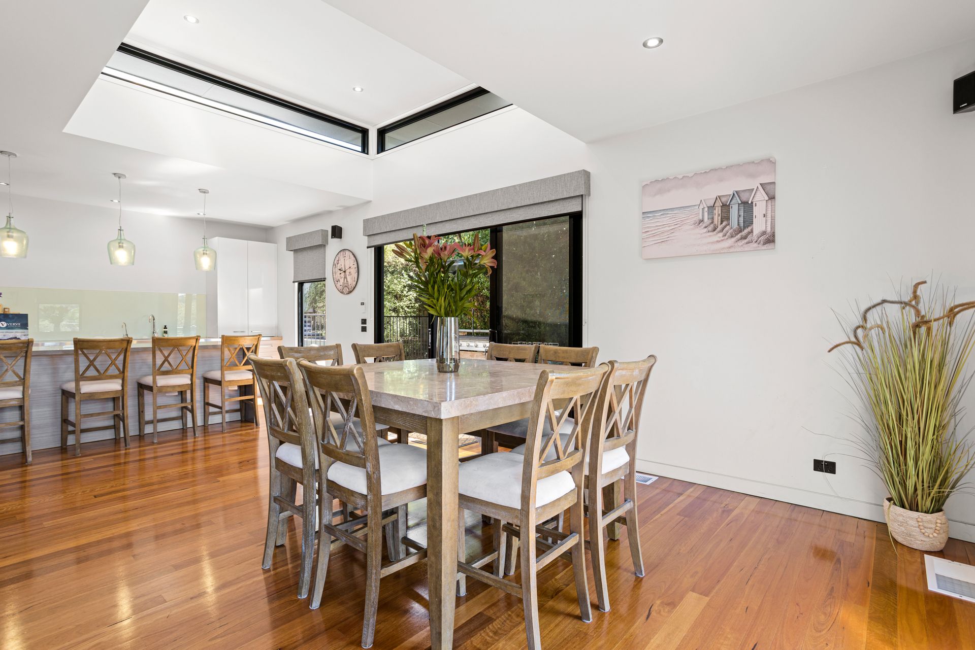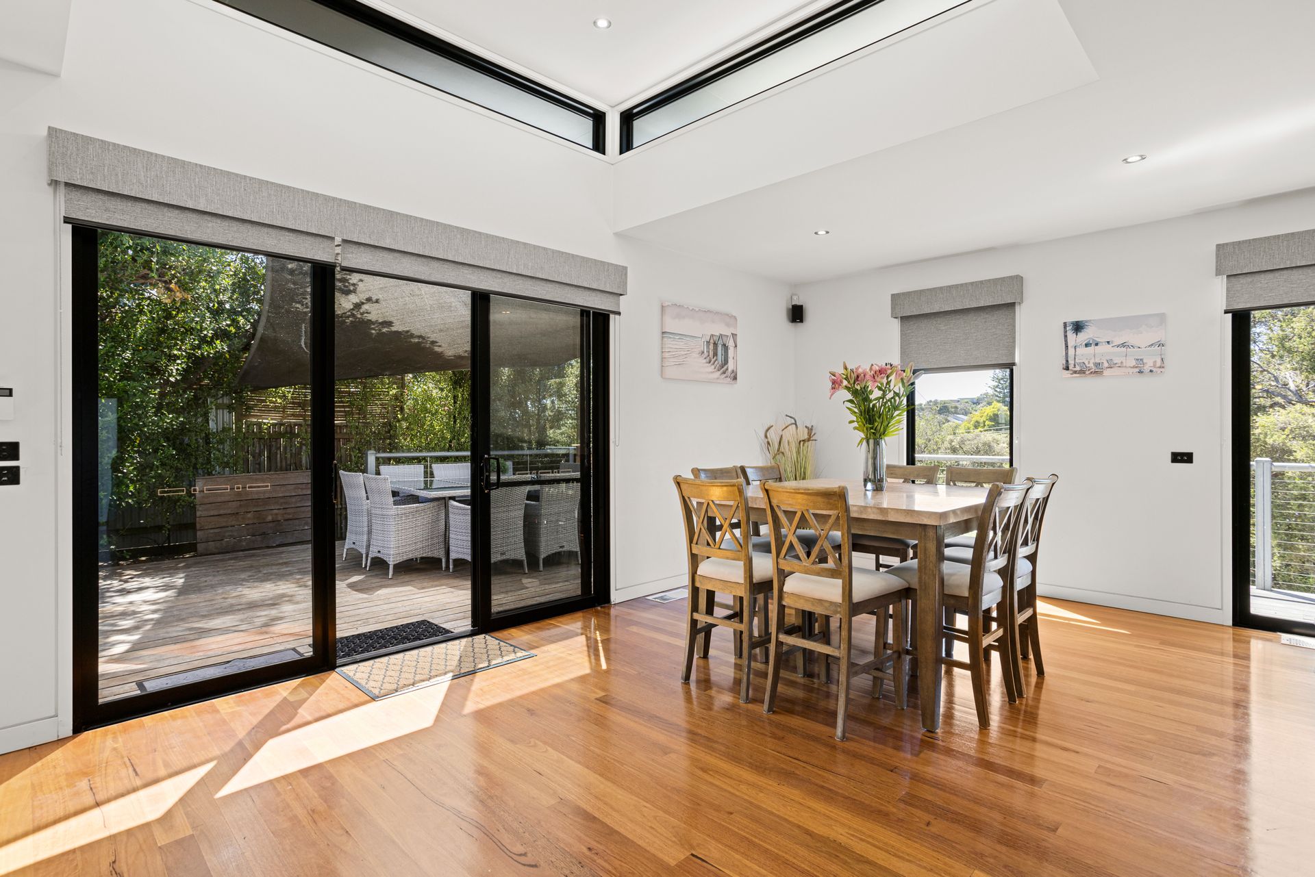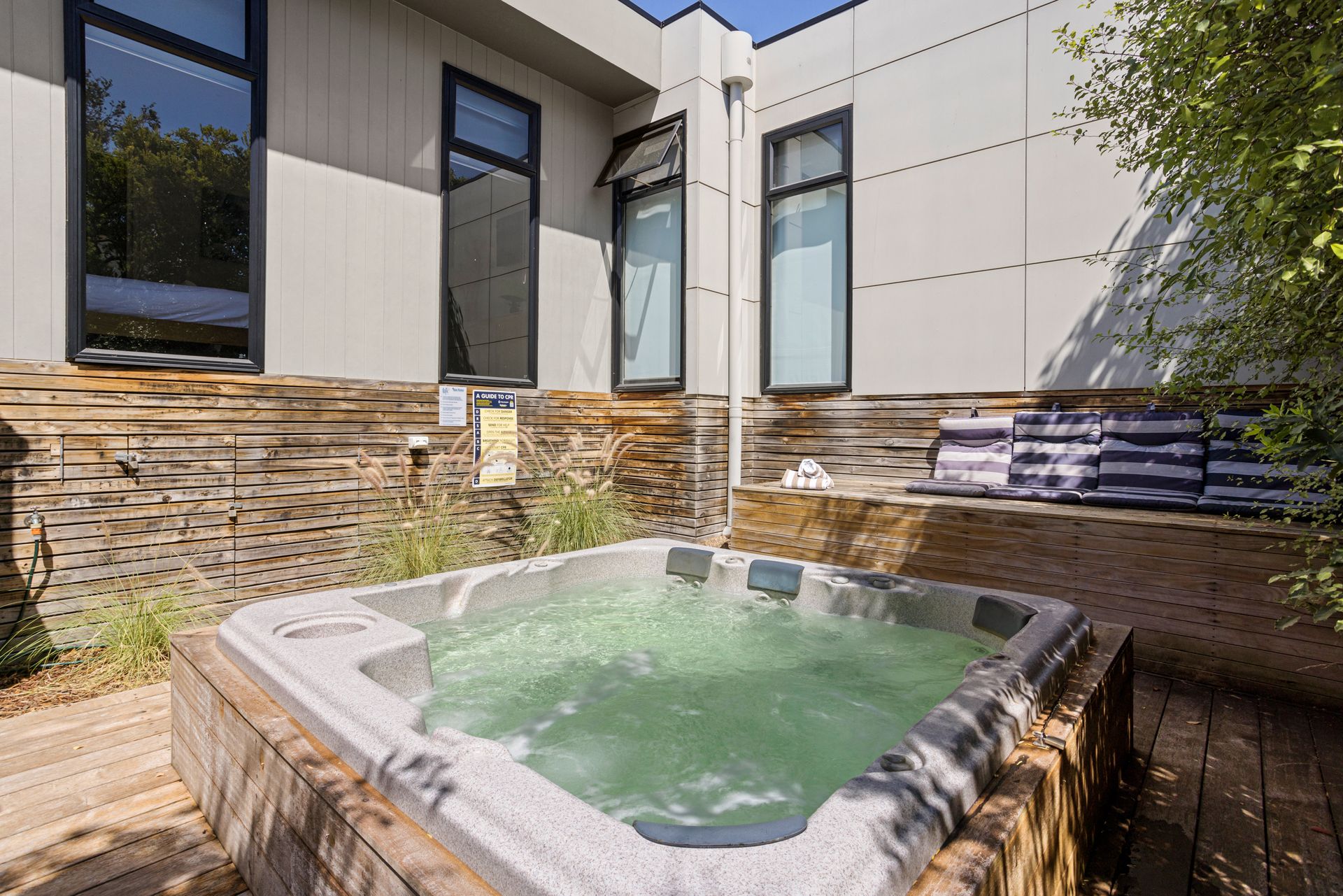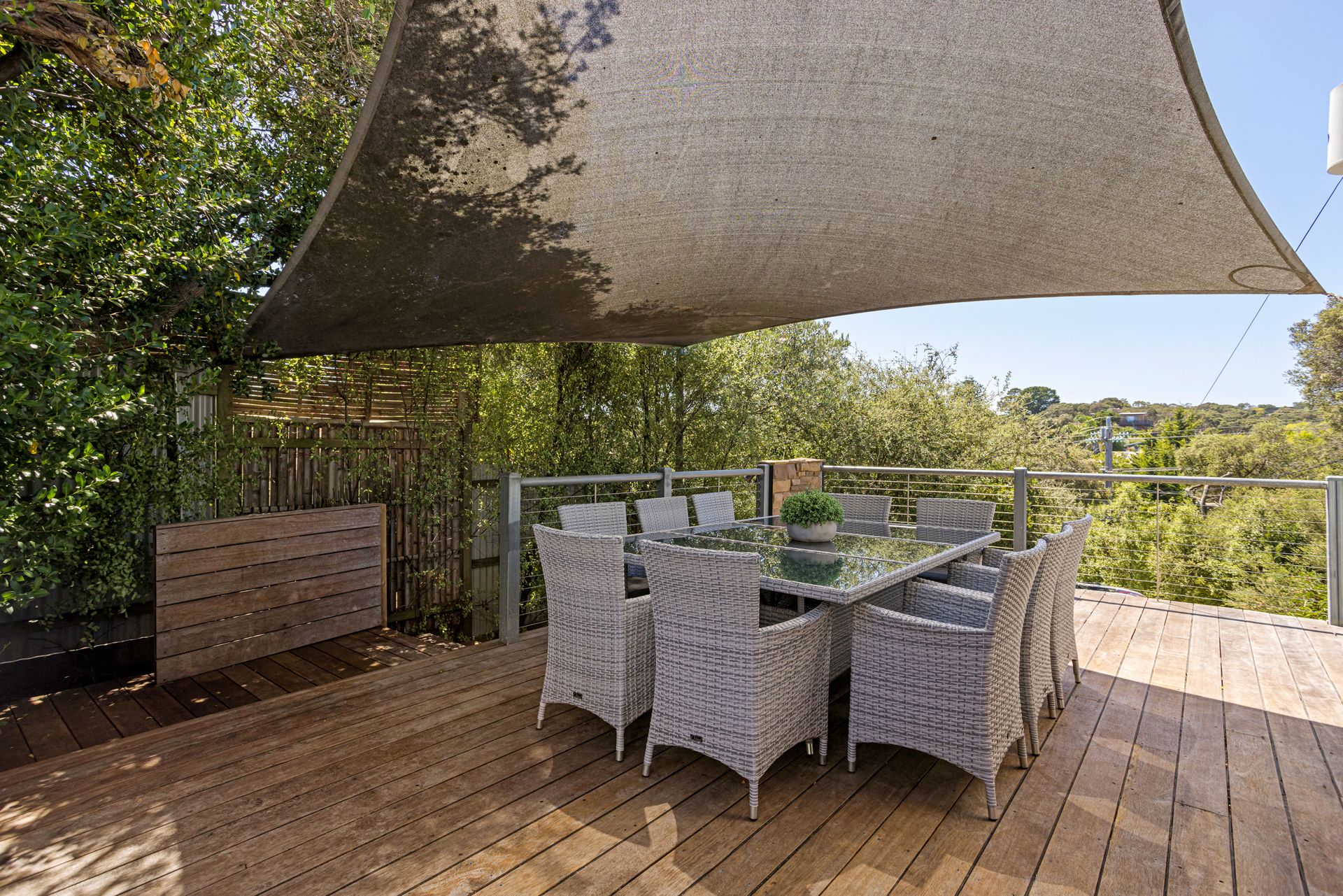 Adjacent to the Kitchen/Dining room you will find living zone 3 - the outdoor barbeque and spa area with expansive decking, complete with a 10 seater outdoor table and barbeque. Covered by a huge sun sail, you can sit there for hours! Wonderful entertaining area.