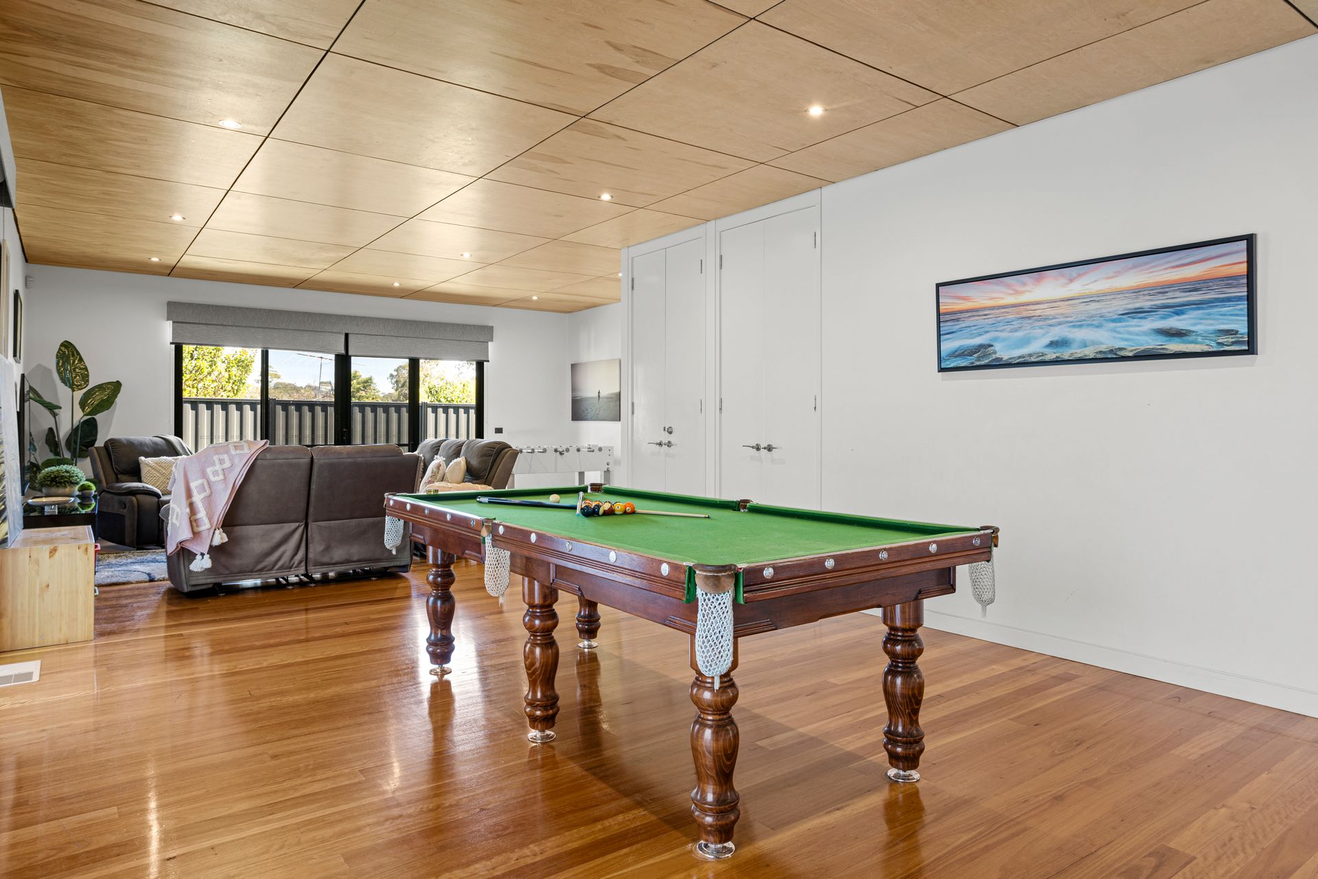 There is another sensational living zone for the kids (or adults) complete with a pool table and entertainment system. Stunning leather lounges, WiFi, Smart TV with Netflix, Playstation, Foosball table, plus bar fridge. This is entertainment heaven, kids will be entertained for hours in this ultimate play zone! Or they can step outside and bounce on the springless (very safe) trampoline.