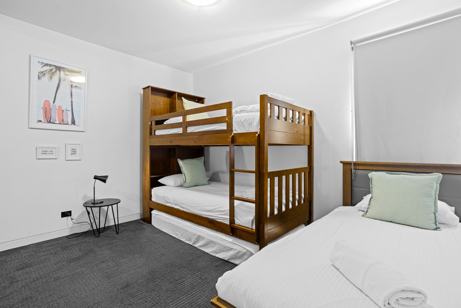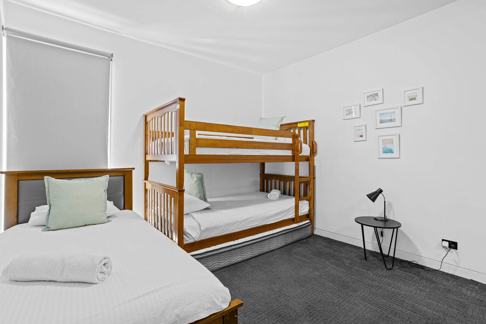 Bedrooms 3 and 4 - identically accommodate 3 guests with a 1 x Set of bunks and 1 x King Single bed in each room.