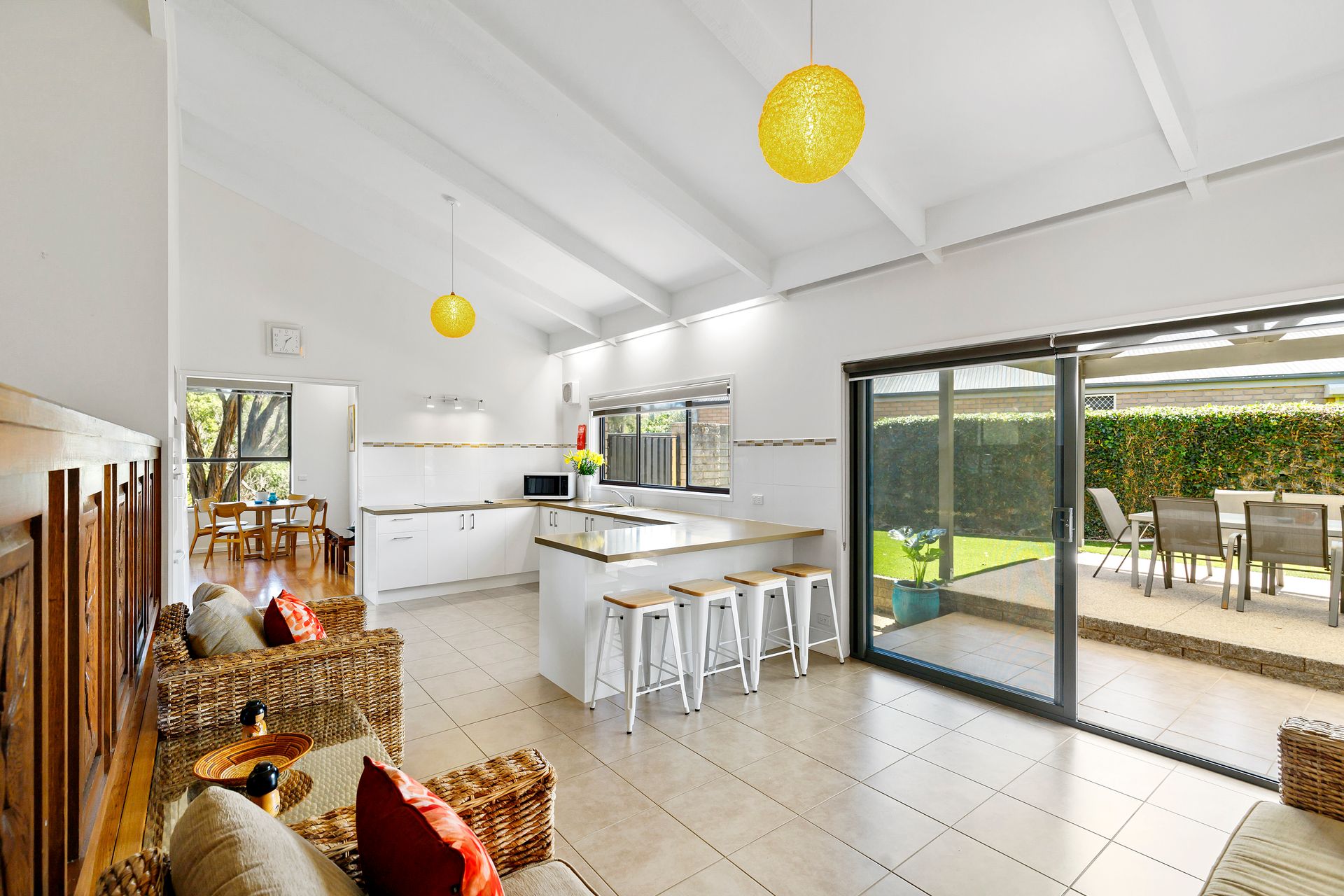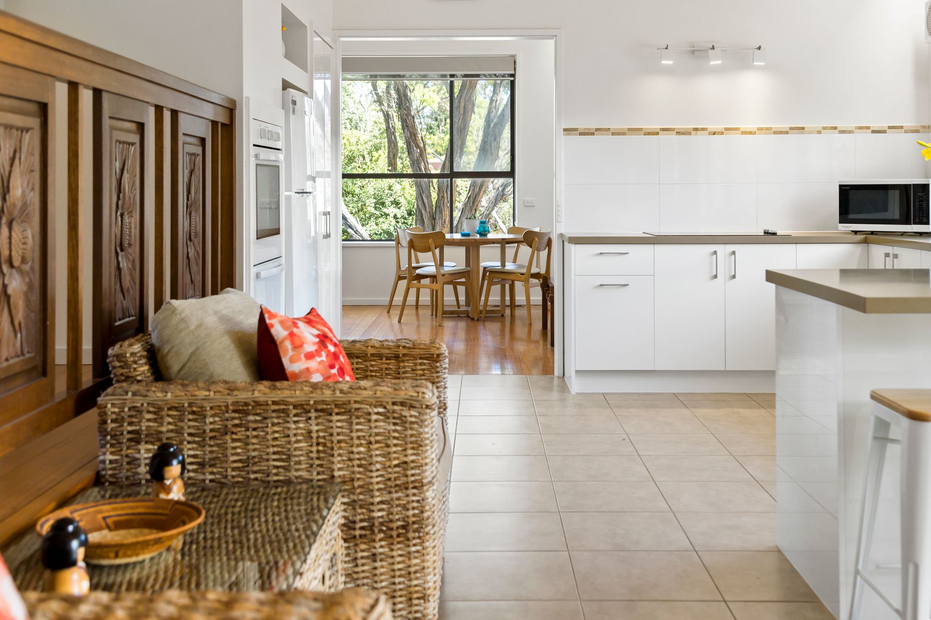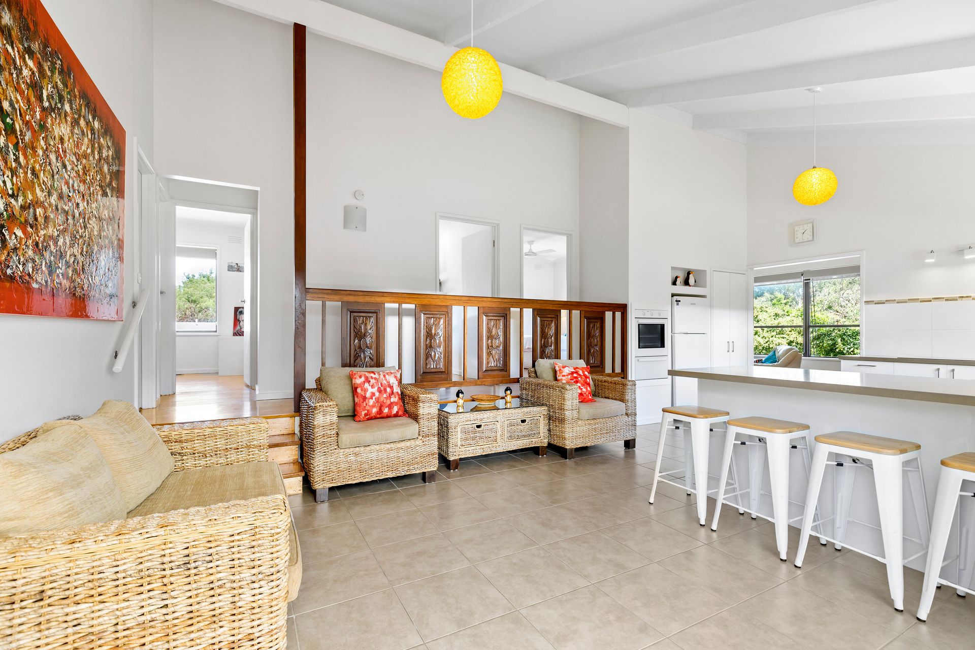 The Kitchen is an open plan design, fully equipped, and looks out onto the tranquil, spacious alfresco area. Adjacent you will find the dining and lounge area is a wonderful space with lovely furniture and a beautiful outlook over the front garden. When you step outside, you are treated to the covered alfresco entertaining area, offering total privacy and comfort. Complimented with an outdoor setting for 8 guests and a gas BBQ. A great haven for entertaining or relaxing after a fabulous day at the beach or sitting back and having a drink.