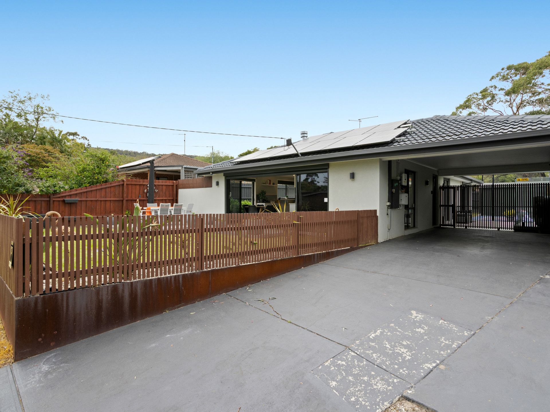 Secure carport parking for 3 cars, off-street parking for 2 cars and boat space