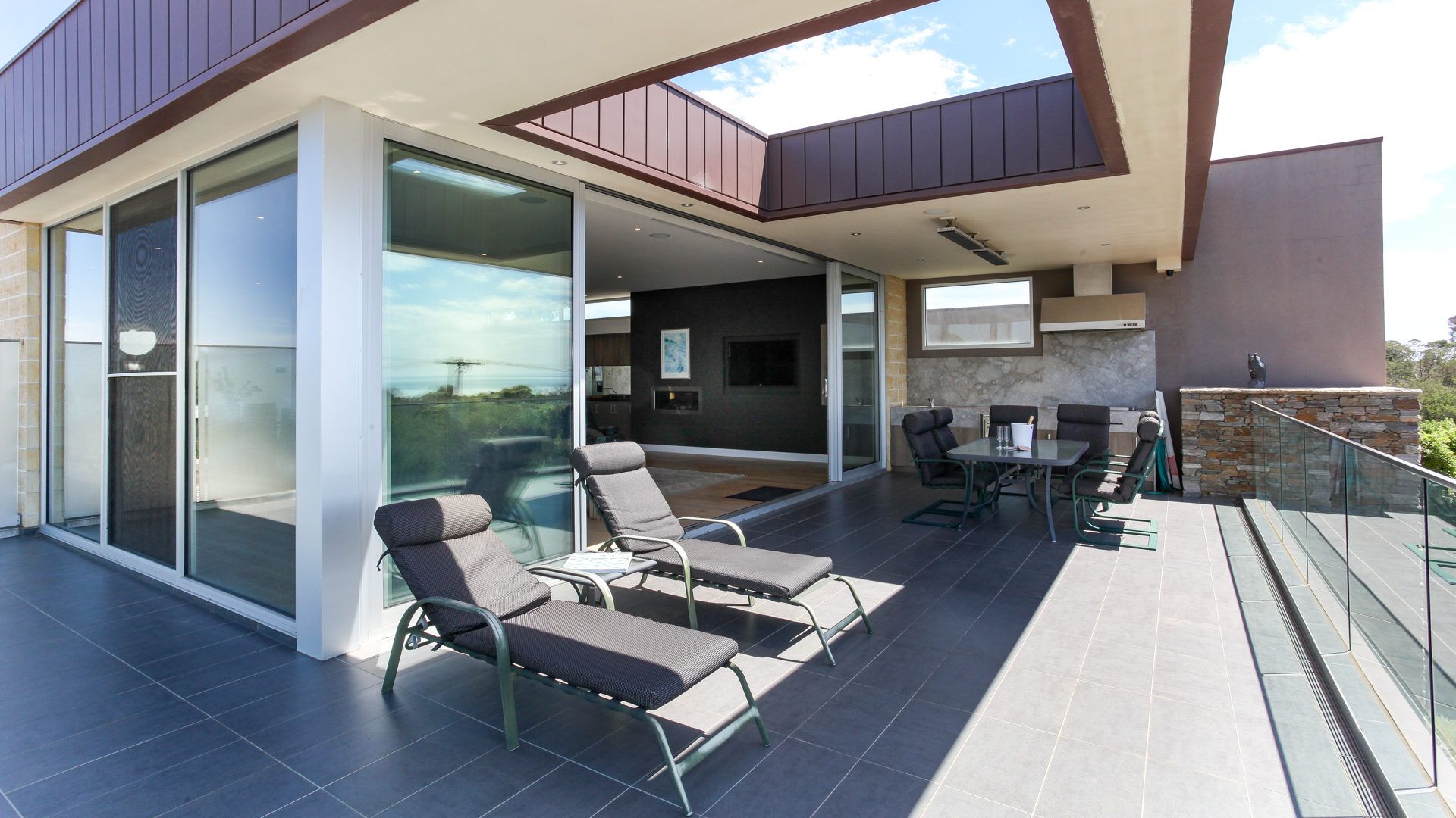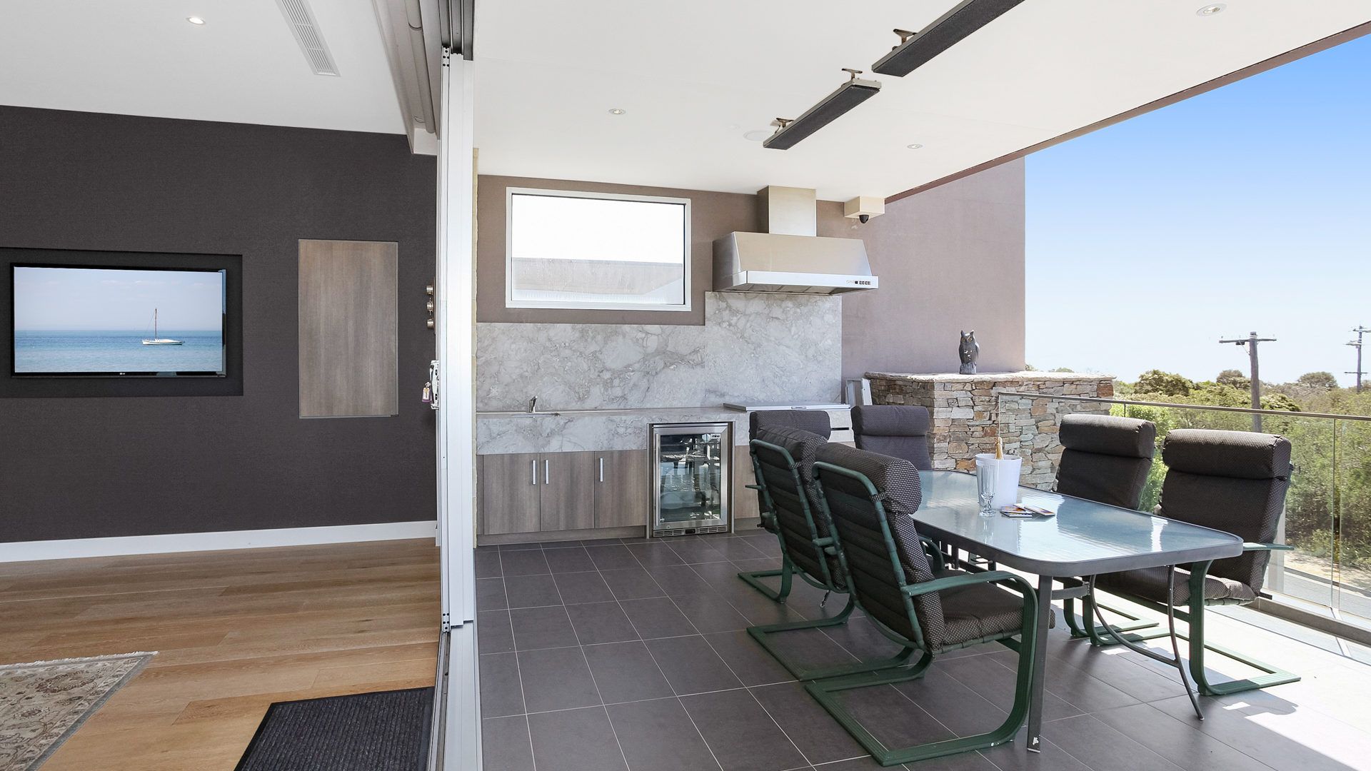 The main living zone is also located on the upper level with a casual living/dining area centred around a modern cutting edge kitchen, complete with a butlers pantry, Miele appliances, and a large island bench. Dining setting for 10 guests, big comfy lounges, gas log fire complemented with the spectacular backdrop of Port Philip Bay. Floor to ceiling sliding doors opening out to an undercover balcony, offering commanding bay views, and outdoor BBQ /Kitchen, outdoor dining setting, and sun lounges showcasing uninterrupted views of the water. An absolute haven for entertaining!