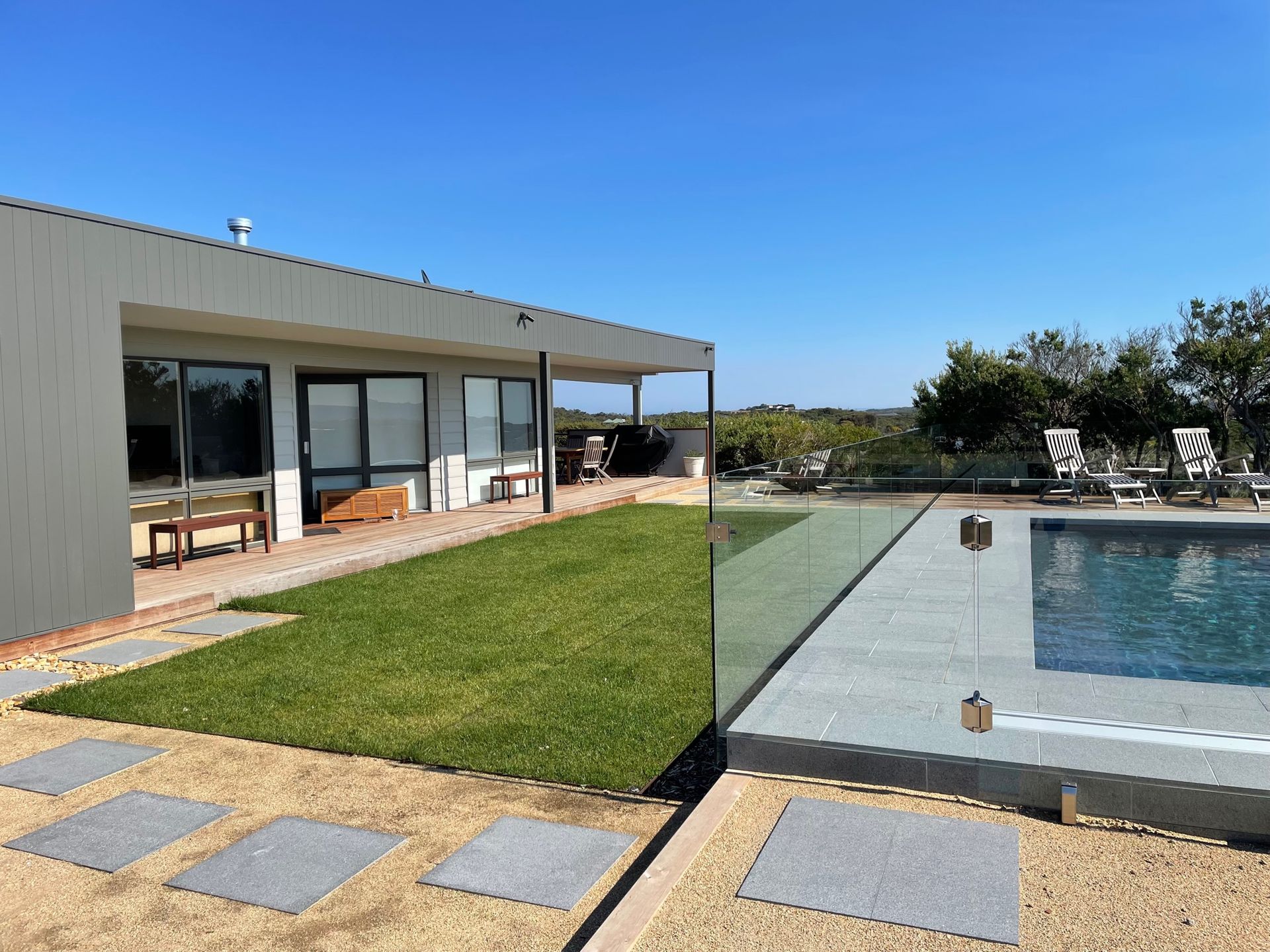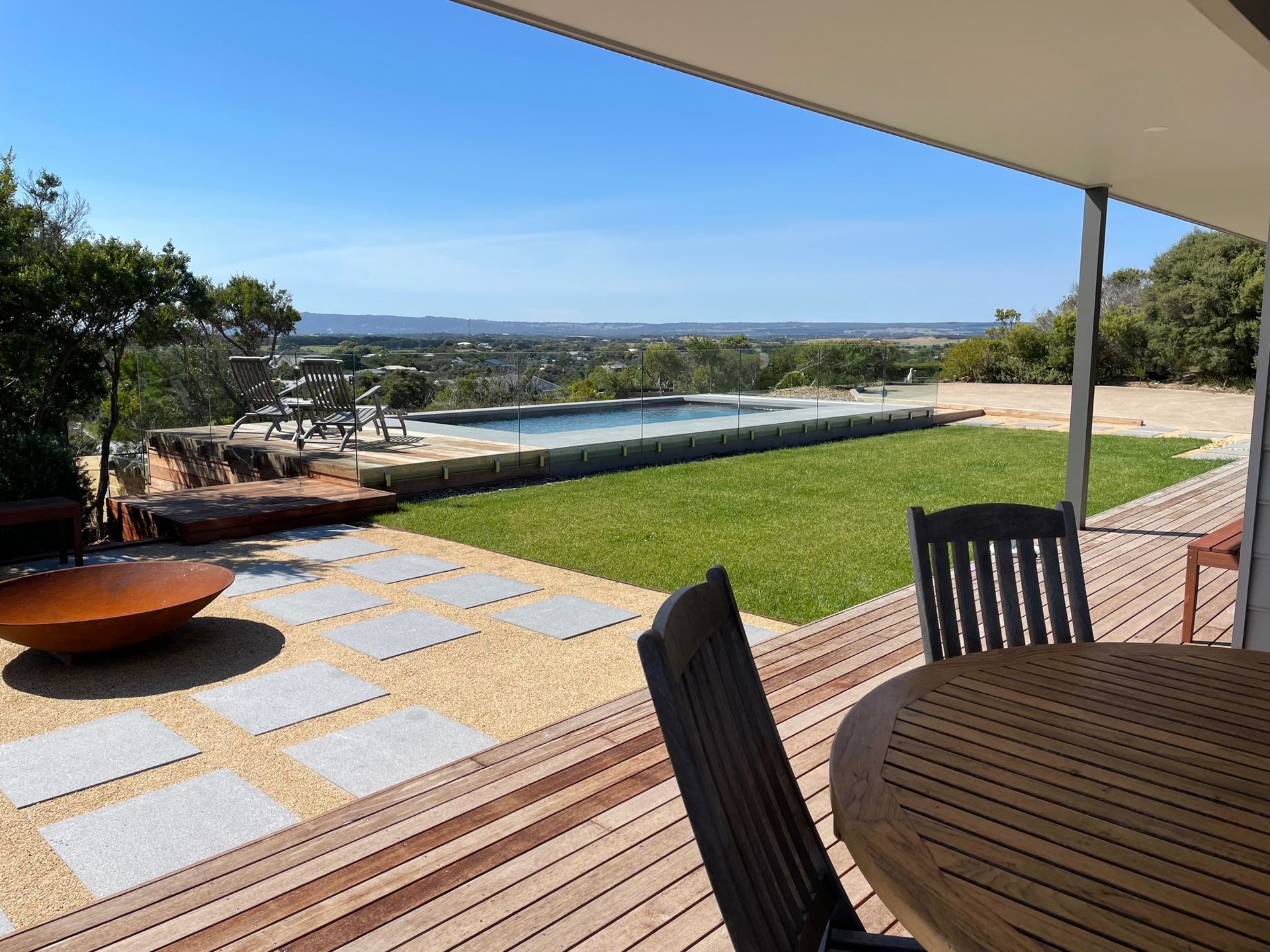The addition of a beautiful salt-water pool which is solar heated and set in the top half of the garden, will allow you to feel like you are at a resort, with its fabulous panoramic views. Lovely grass area too with outdoor dining.
