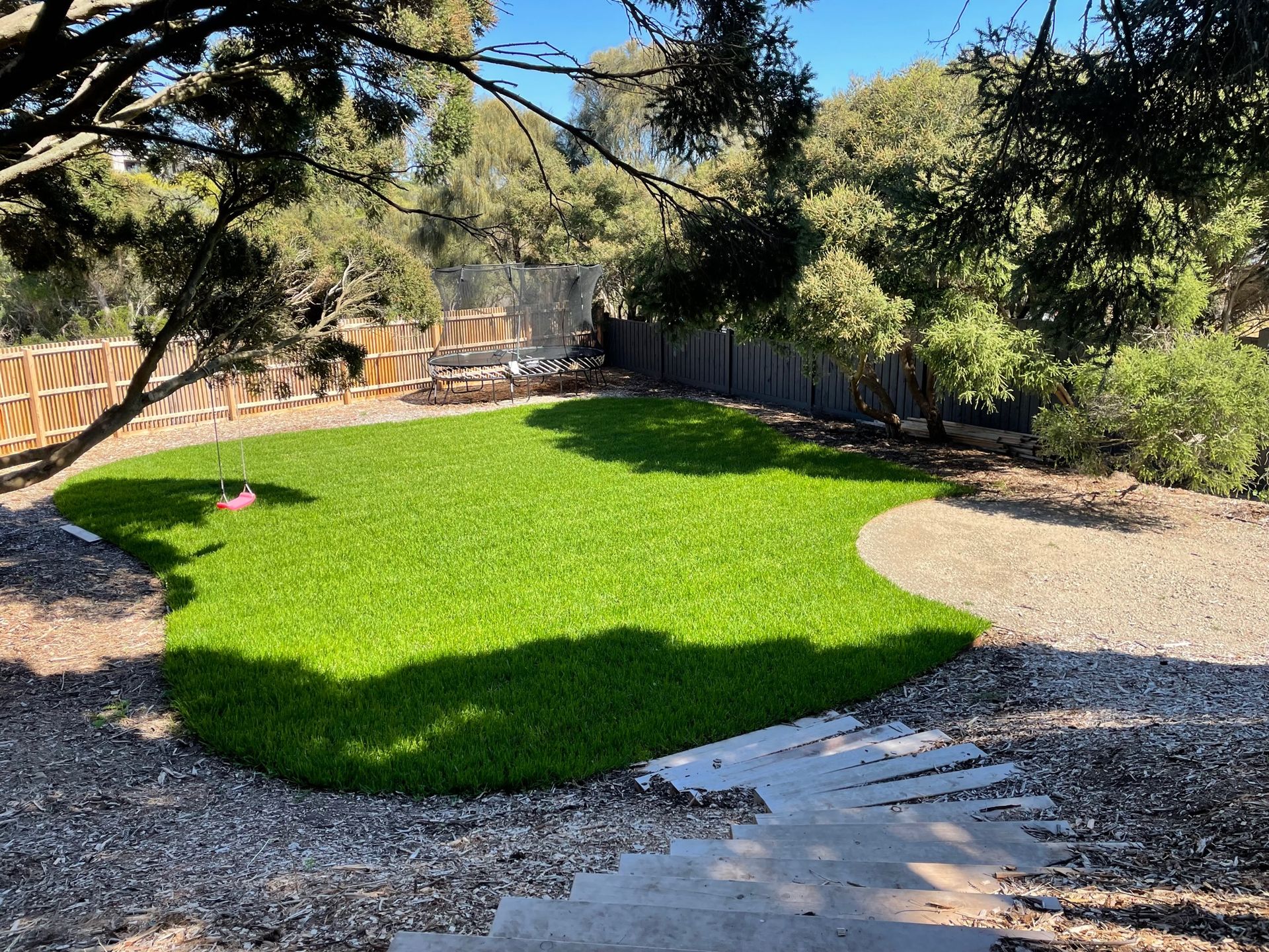 Front gates allow you to close off the property for security with a child friendly front yard with grass, swing and trampoline.